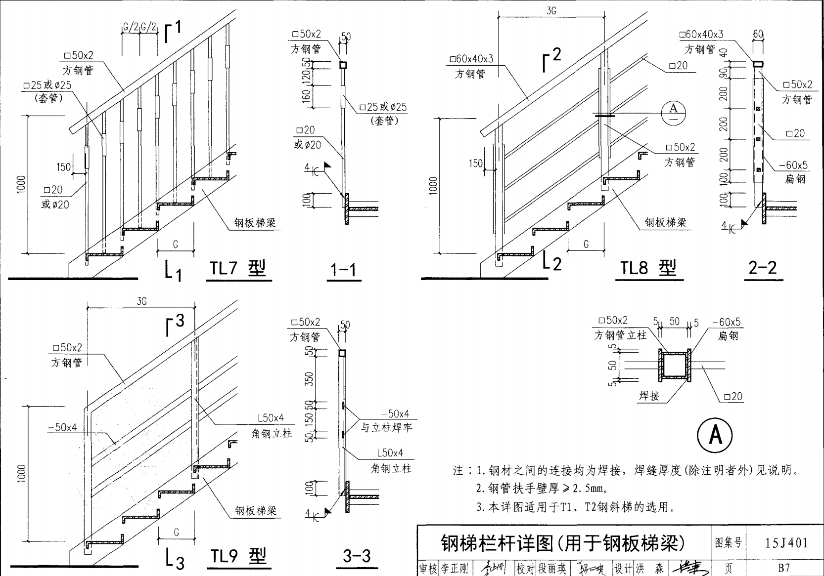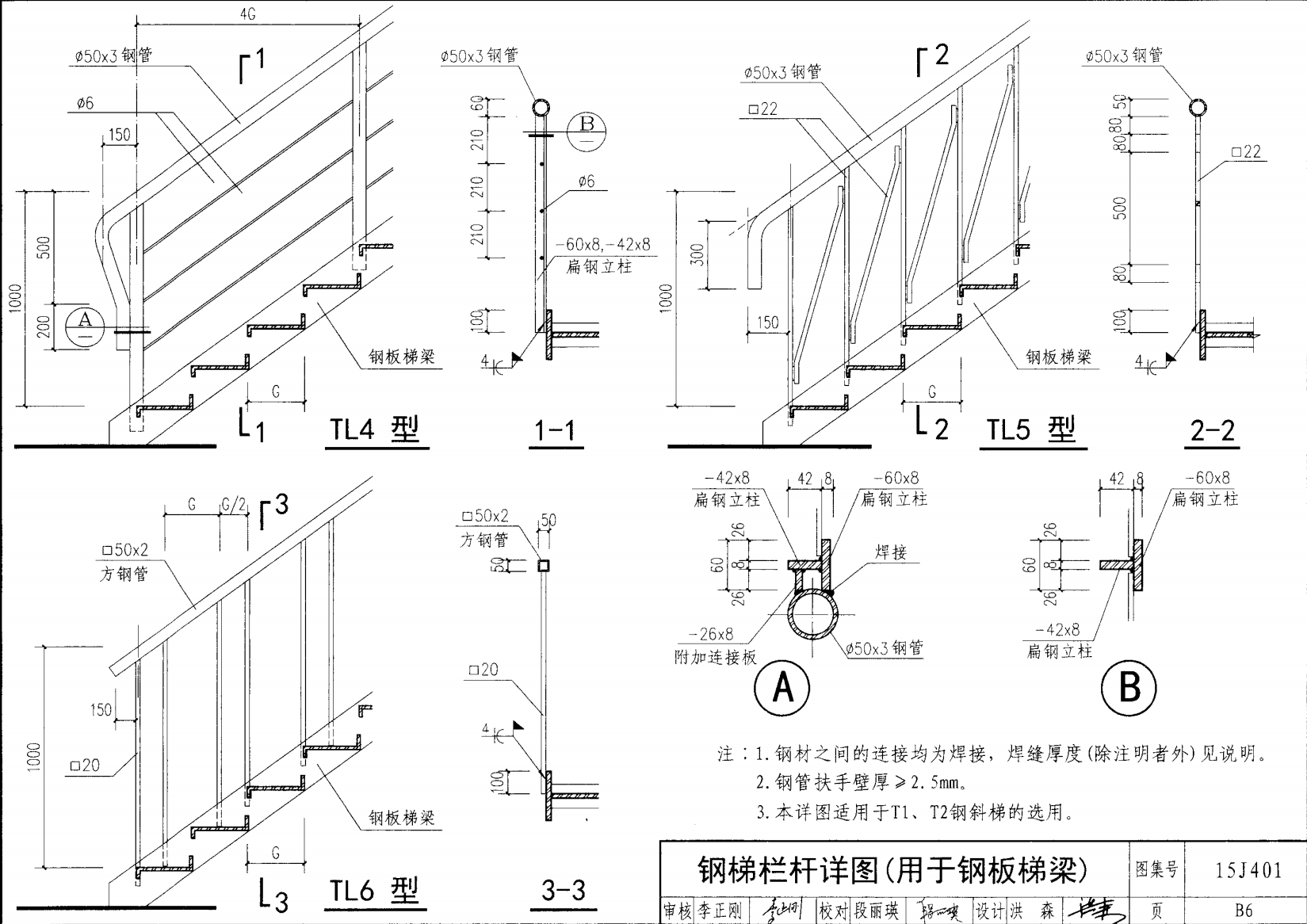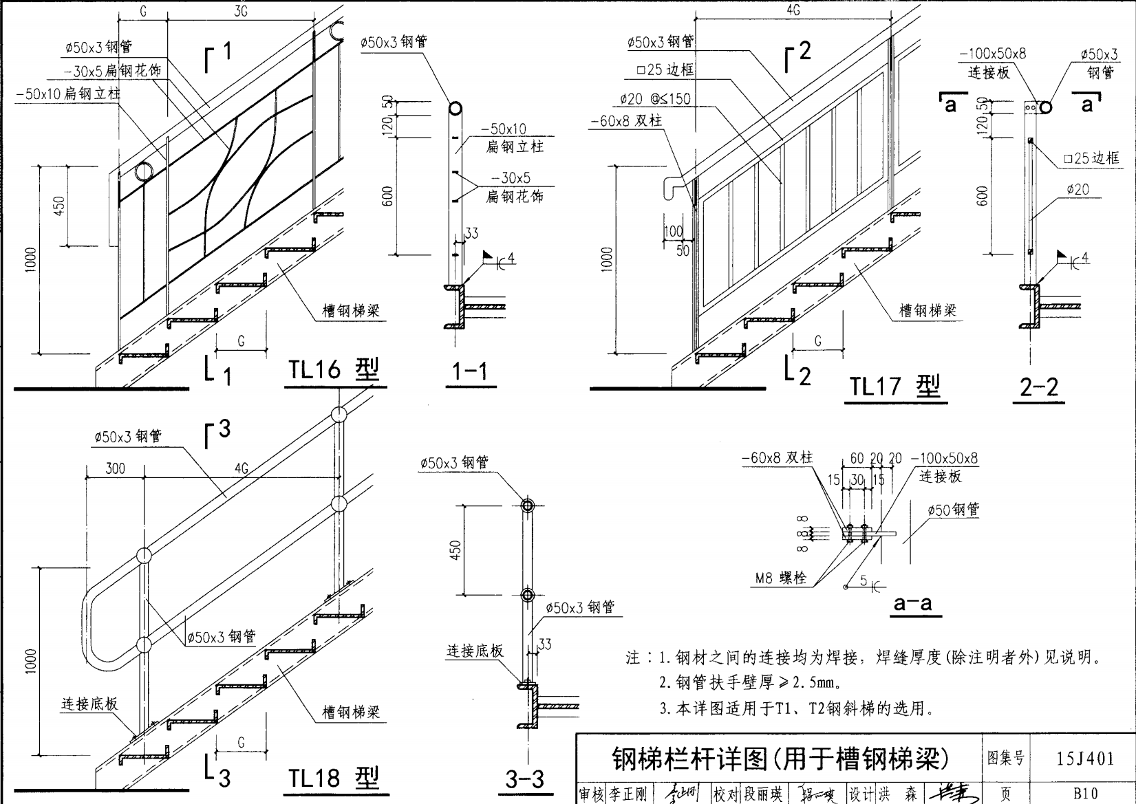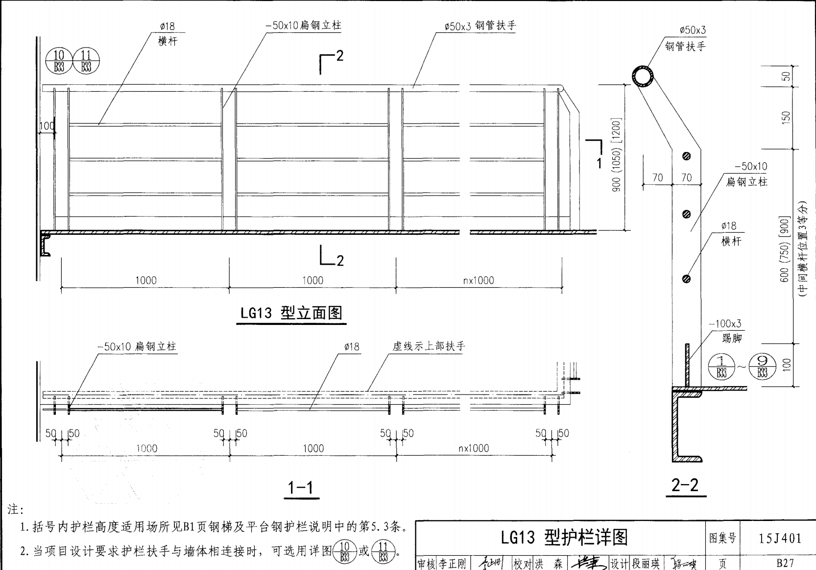 欄桿采用鋼材力學(xué)性能不低于 格證的鋼材Q235-B ,并具有碳含量合 所有欄桿均可用不銹鋼制作 欄桿的焊接要求應(yīng)符合《鋼結(jié)構(gòu)工程施工質(zhì)量驗(yàn)收規(guī)范》 GB50205-2001 證結(jié)構(gòu)設(shè)計(jì)強(qiáng)度的規(guī)定。當(dāng)焊接不便時(shí)可用螺栓連接,但應(yīng)保 鋼質(zhì)欄桿的涂裝要求可以熱鍍鋅和噴漆,噴塑 施工中如果用其他型鋼取代圖集中的立柱或減少立柱截 面尺寸,都應(yīng)按荷載規(guī)范認(rèn)真核算,以確保安全