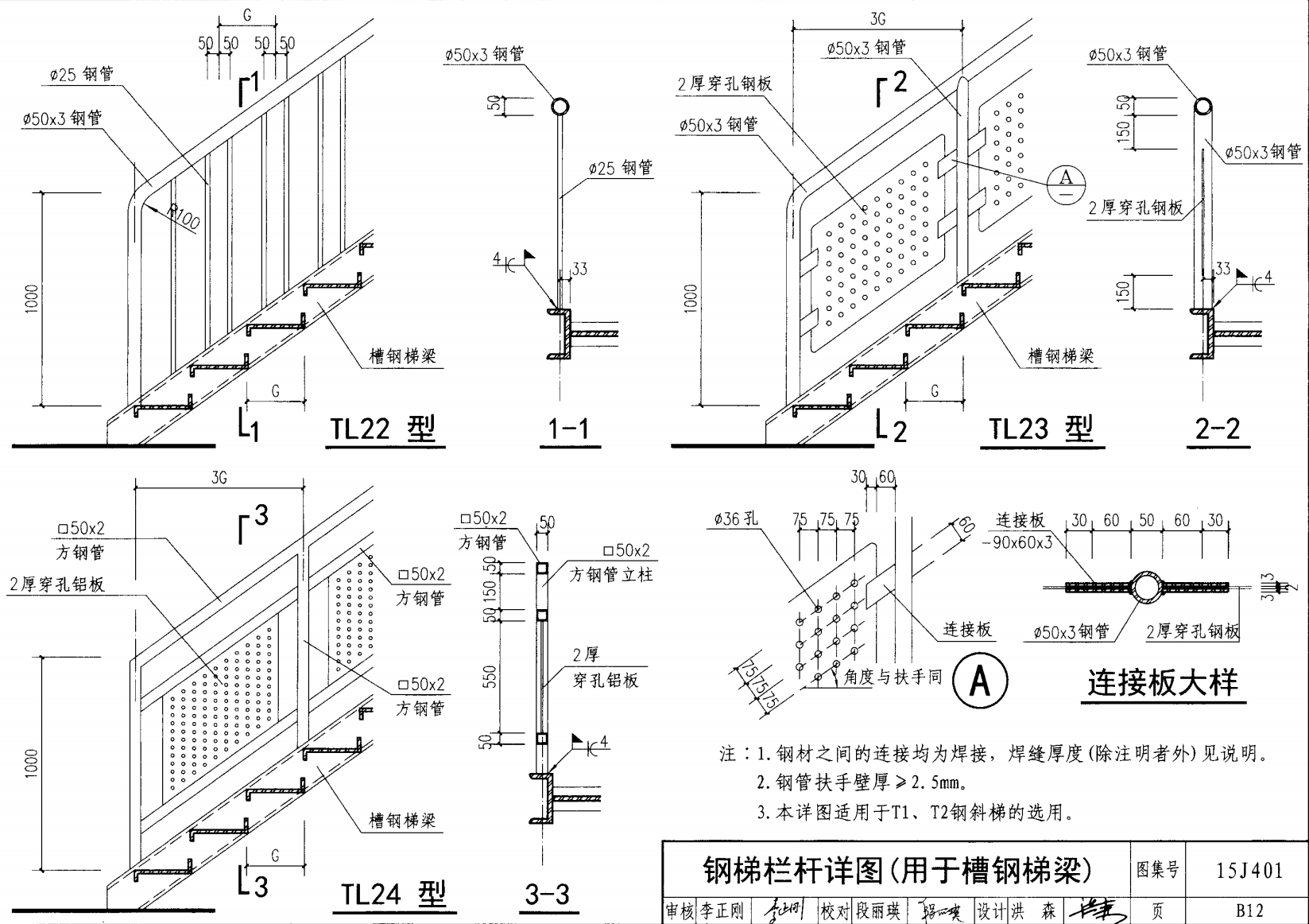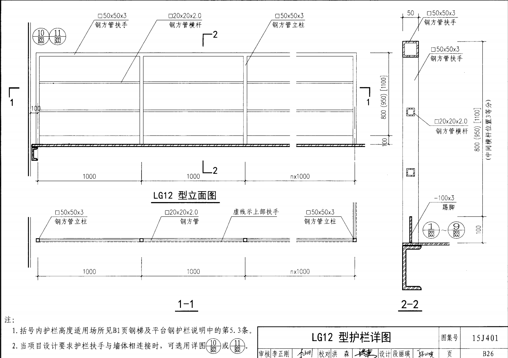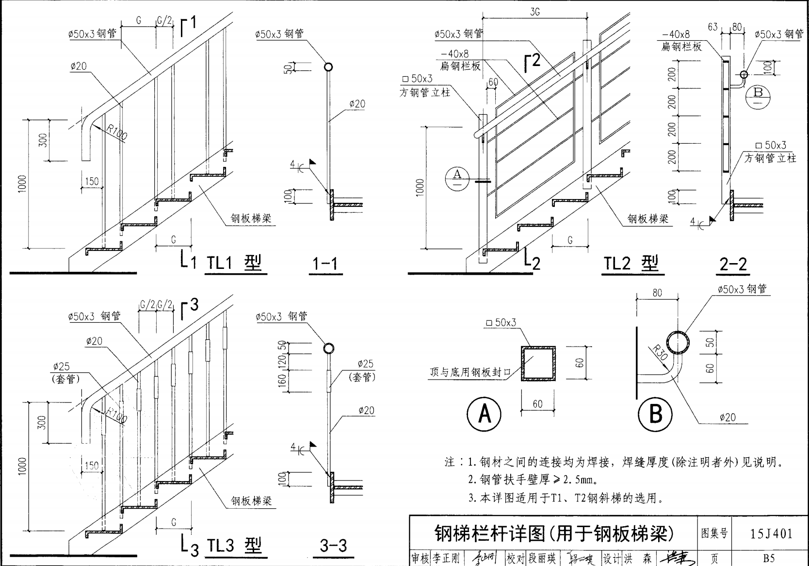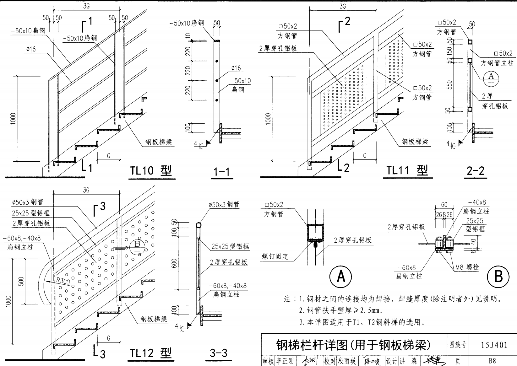 欄桿采用鋼材力學(xué)性能不低于 格證的鋼材Q235-B ,并具有碳含量合 所有欄桿均可用不銹鋼制作 欄桿的焊接要求應(yīng)符合《鋼結(jié)構(gòu)工程施工質(zhì)量驗(yàn)收規(guī)范》 GB50205-2001 證結(jié)構(gòu)設(shè)計(jì)強(qiáng)度的規(guī)定。當(dāng)焊接不便時(shí)可用螺栓連接,但應(yīng)保 鋼質(zhì)欄桿的涂裝要求可以熱鍍鋅和噴漆,噴塑 施工中如果用其他型鋼取代圖集中的立柱或減少立柱截 面尺寸,都應(yīng)按荷載規(guī)范認(rèn)真核算,以確保安全