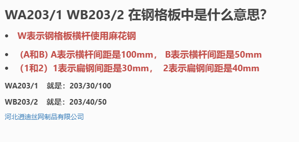 W表示鋼格板橫桿使用麻花鋼 (A和B) A表示橫桿間距是100mm, B表示橫桿間距是50mm (1和2)1表示扁鋼間距是30mm, 2表示扁鋼間距是40mm...